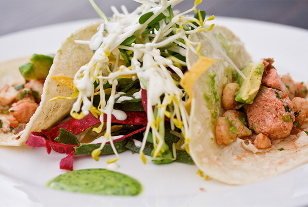 4 flour tortillas, house jerk-sauce, crema, mixed greens, diced mango, slaw, garnished with cilantro, diced onion, green apple